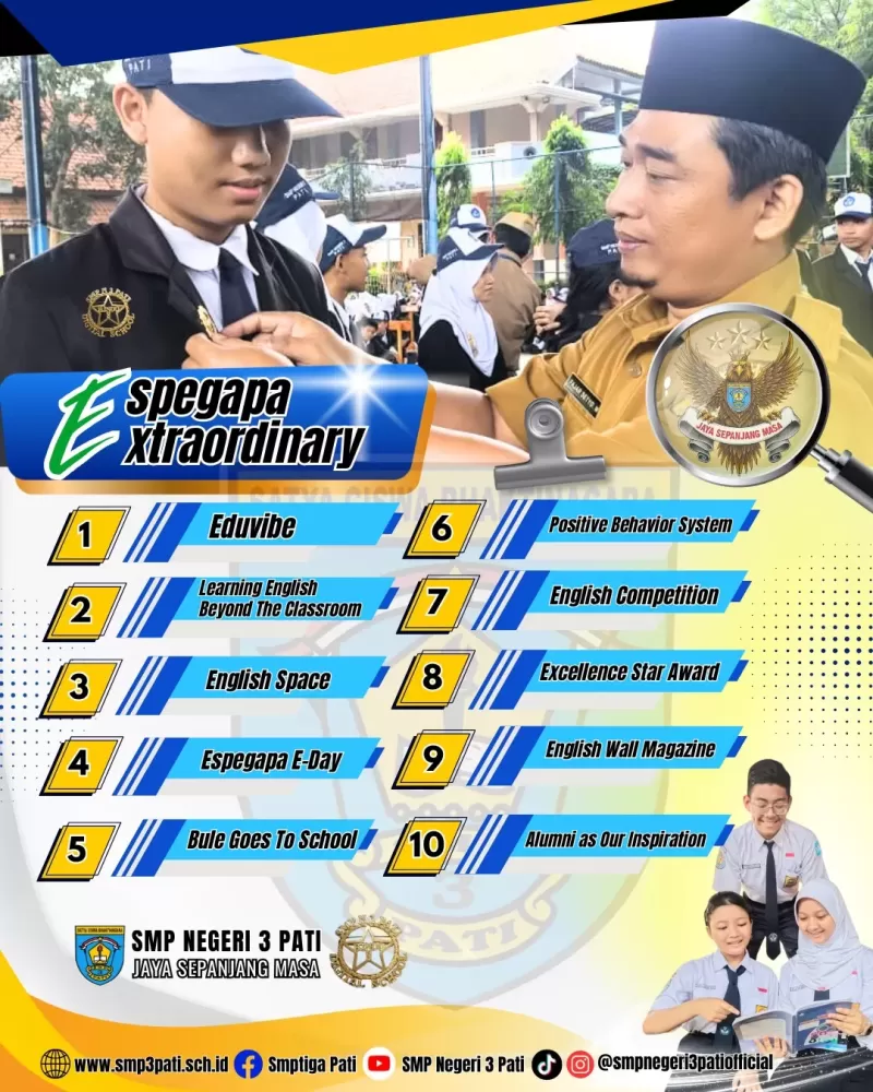 SMP Negeri 3 Pati kembali menunjukkan komitmennya sebagai sekolah unggulan melalui peresmian program baru bertajuk Espegapa Extraordinary. Program inovatif ini resmi diluncurkan pada Jumat, 6 Februari 2026, dan diresmikan langsung oleh Kepala SMP Negeri 3 Pati, Bapak Fajar Setyo Nugroho. Peluncuran program ini menjadi tonggak penting dalam upaya sekolah menghadirkan pendidikan yang adaptif, inspiratif, dan berorientasi pada pengembangan potensi peserta didik secara menyeluruh.